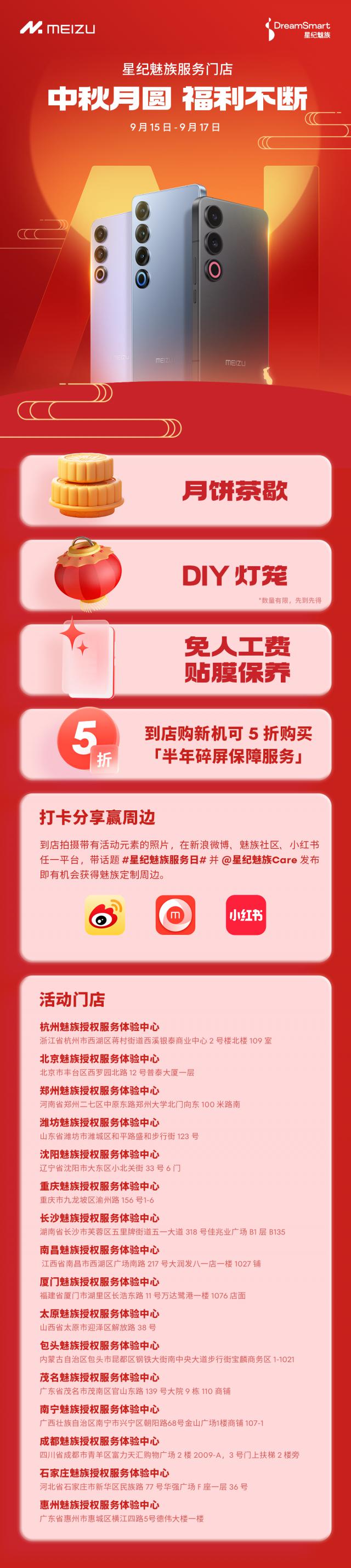 IT 世家 9 月 15 星纪魅族服务商店日新闻 9 月 15 日至 9 月 17 日开中秋活动,顾客前往指定商店品尝月饼,自制精美灯笼,进店购买新机器支持。 5 折选购「半年碎屏保障服务」。