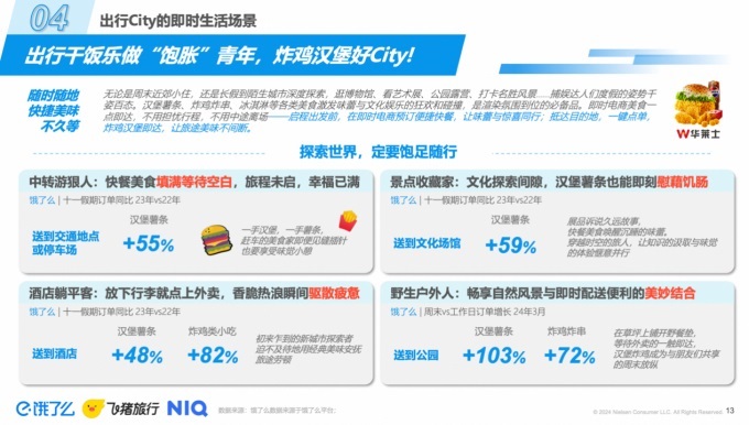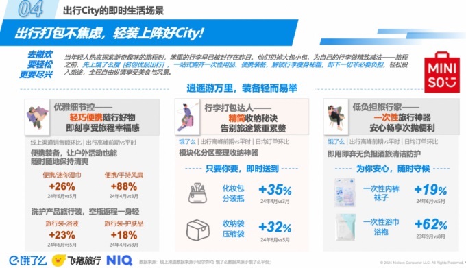 “city今年没有city“梗在社交网络上走红,网友们用梗来呈现个性化、多元化的城市打卡方式,这体现了当下年轻人旅行观念的变化。国庆节前夕,饿了么联合飞猪、尼尔森IQ联合发布了《2024年轻松出行趋势洞察》。报告显示,空包旅游、租车自驾、酒店躺游等逐渐成为更多年轻人“轻松出行”的新途径。国庆节假期进入倒计时,饿了么上“旅游设备”相关搜索量环比增长150倍以上。