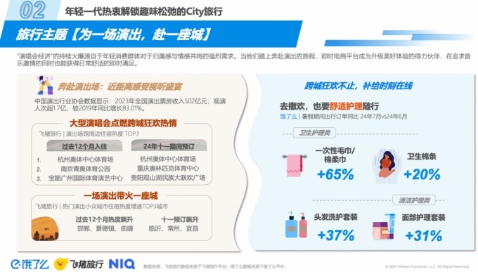 演唱会、取景地、剧情综艺游逐渐成为更多年轻人“说走就走”的旅游目的。今年国庆节,山西朔州因“黑悟空”取景地成为预定量增长最高的城市。由于表演,临沂、常州、宜昌等地的住宿预订热度也在全国排名前三。