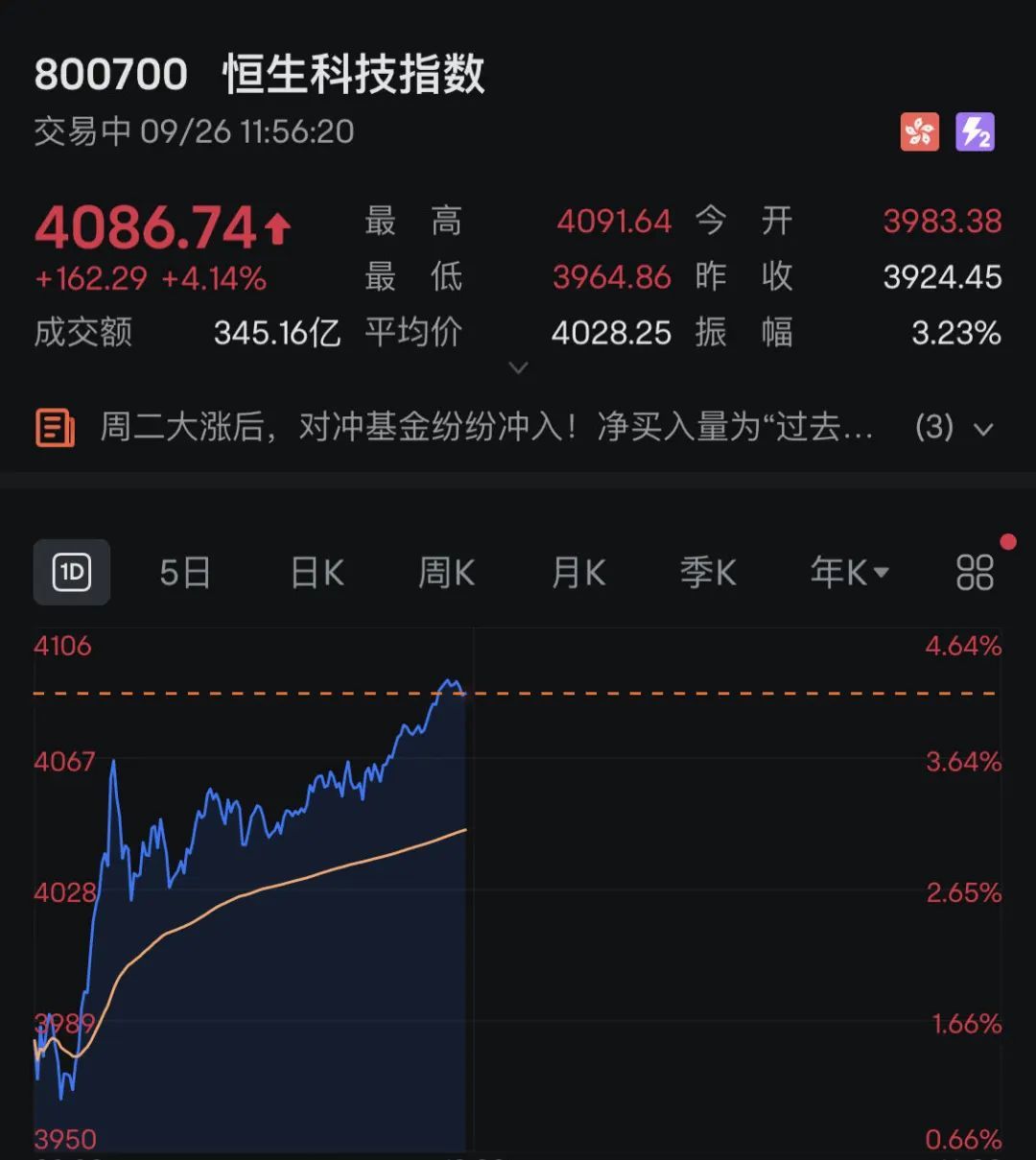 在港股方面,恒生指数持续上涨,涨幅超过2%,而恒生科技指数大幅上涨超过4%。