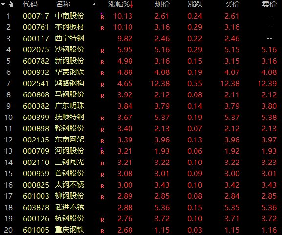 钢铁股近日持续大幅上涨,今日整体上涨近3%,创近两个月新高。中南股票开盘涨停,连续第四天收盘,股价创近7个月新高;西宁特钢和本钢板都是垂直拉高涨停,均为3日2日涨停,华菱钢铁涨幅居前。