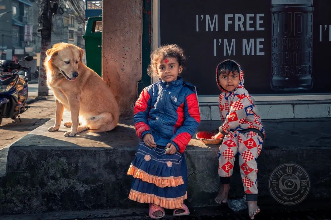 2023年11月在尼泊尔拍摄。两个姐妹和他的小狗在一起。