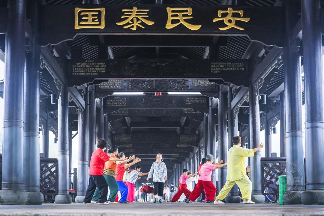 浙江省杭州建德市寿昌镇艾溪状元廊桥,2020年7月6日,运动与休闲步行者。