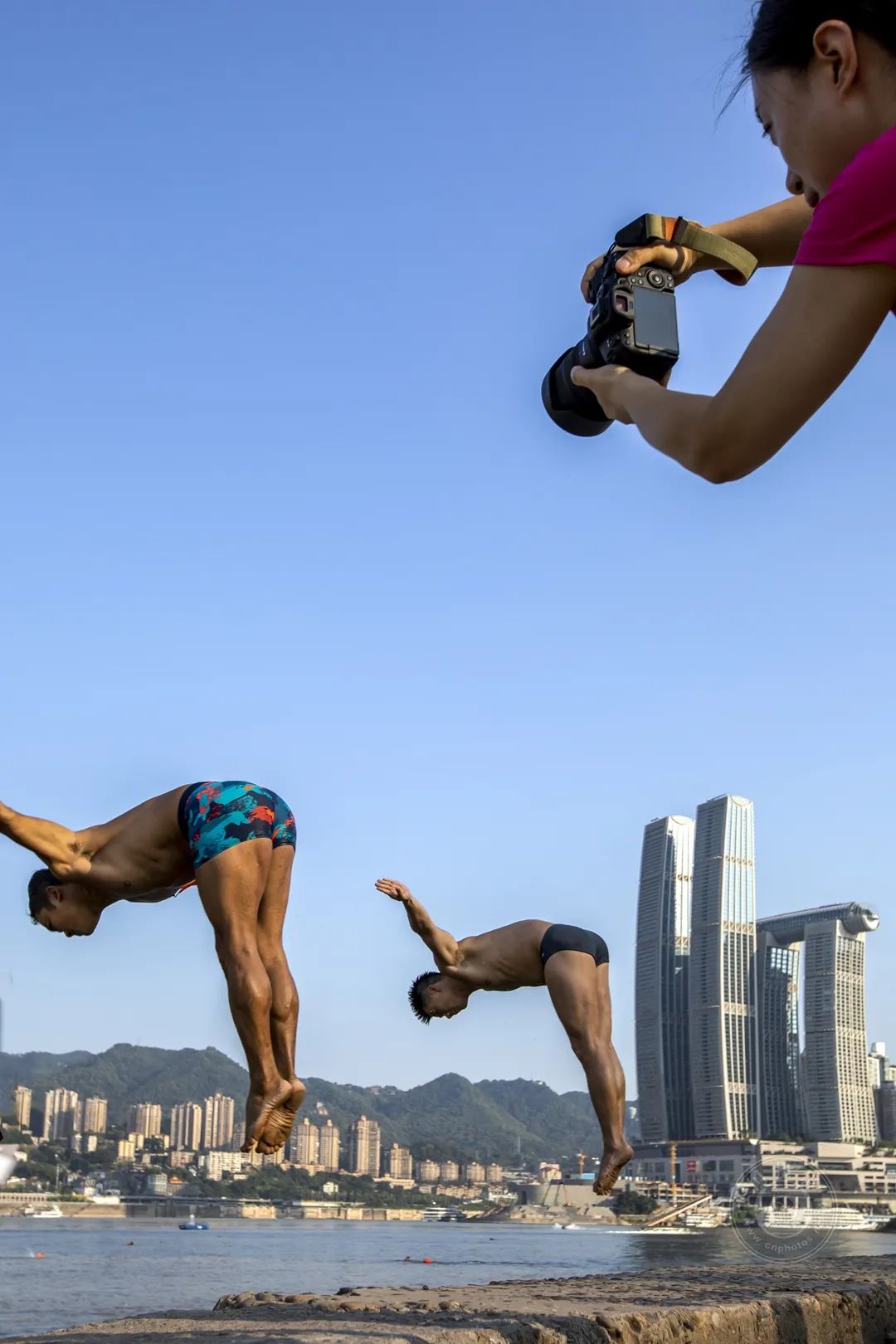 在重庆江北梁沱长江边,一名摄影师正在捕捉两名游泳爱好者进行跳水训练。