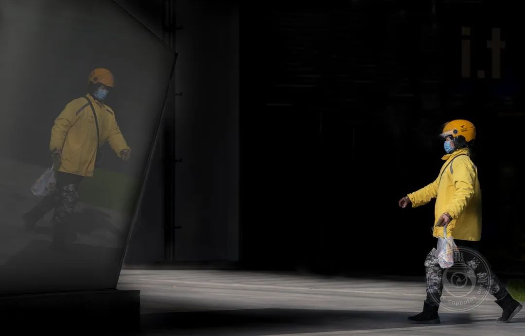 拍摄于2022年1月11日,山东济南。外卖小哥跑单特别辛苦,出现在大街小巷,偶然遇到墙对面,算是对自己的一张照片。
