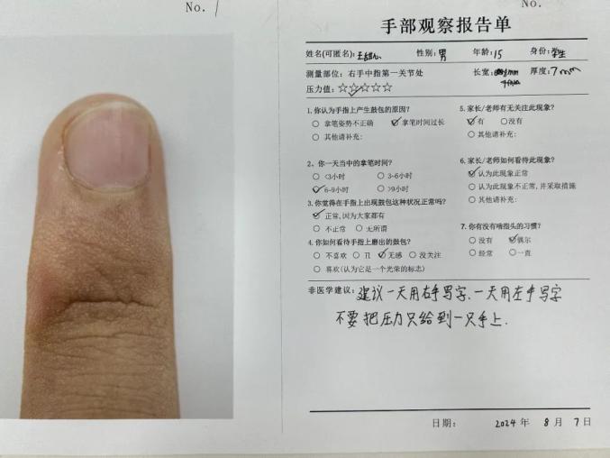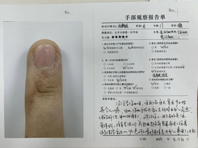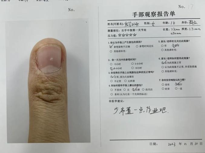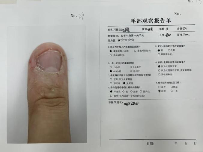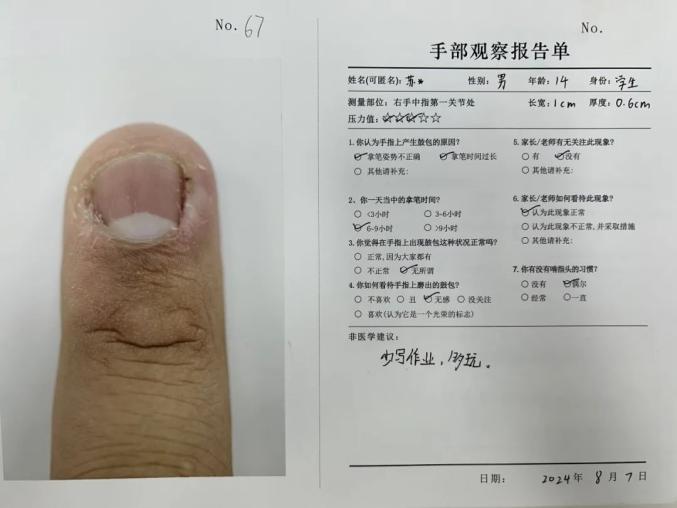 对于被拍到的同学,我还准备了一份手部观察报告,这份问卷的目的是让同学们关注自己的手指,产生认知。参加这次拍摄和问卷调查的学生大多年龄在13至18岁之间,其中14岁的学生比例最大。当被问及“你如何看待手上的包”时,两个学生表达了对包的喜爱。其中一个男生认为包是一个光荣的标志。包越大,学习越认真,成绩越好。当被问及“家长/老师如何看待,是否关注学生手中的包装现象”时,85%的学生写道家长或老师认为这种现象正常,75%的家长/老师不关注这种现象。