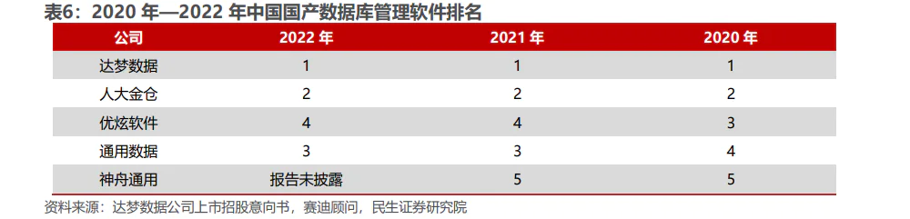 达梦数据在2020-2022年中国国内数据库管理软件市场份额排名中排名第一(由于阿里巴巴云、华为、腾讯等公共云厂商的数据库产品运营模式差异较大,在赛迪顾问的报告中没有对其进行排名统计)。