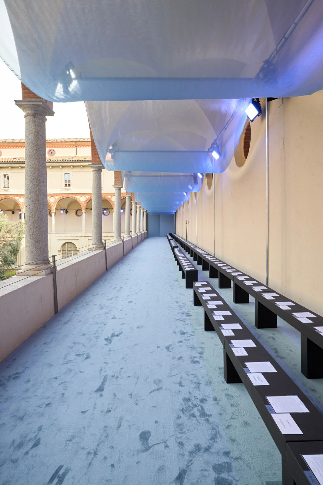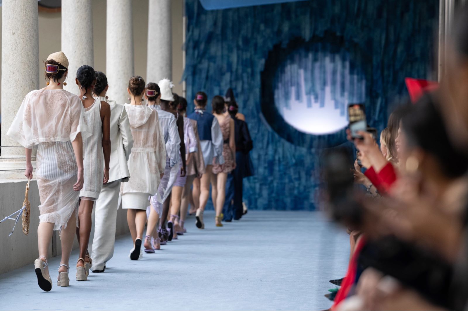 据悉,大秀当天,模特们带着蓝色的动线走进博物馆绿意盎然的内庭,仿佛踏上了天海间的旅程。现场观众对这种空间分离的建筑技术感到惊讶,巧妙地围合了整个节目的屋顶和地面两个界面,营造出两种完全不同的空间氛围。内部,建筑与服饰完美融合,共同演绎东方女性的温柔与坚韧,优雅与力量。除了空间,这不仅是一场时尚秀,也是两种艺术语言的碰撞,让人感受到了东方美学的博大精深和女性力量觉醒后“踏浪渐进”的无限魅力。整体呈现就像是铺开了一卷中国传统写意山水画,与外界意大利建筑艺术形成了两种文化的隔空对话。