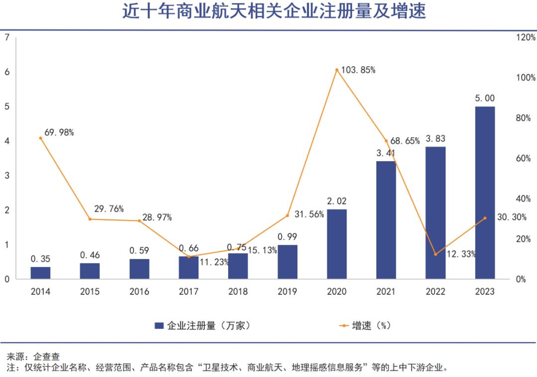 有关企业也呈现出爆发式增长。企业调查数据显示,目前国内商业航天相关企业有19.69万家。从注册数量的变化来看,近十年来相关企业的注册数量呈逐年增长趋势,其中2020年为增长多发期,全年注册相关企业2.02万家,同比增长103.85%。2023年全年注册人数首次超过50,000人,同比增长30.30%,今年8月已注册32,000家相关企业,与去年同期注册水平持平。