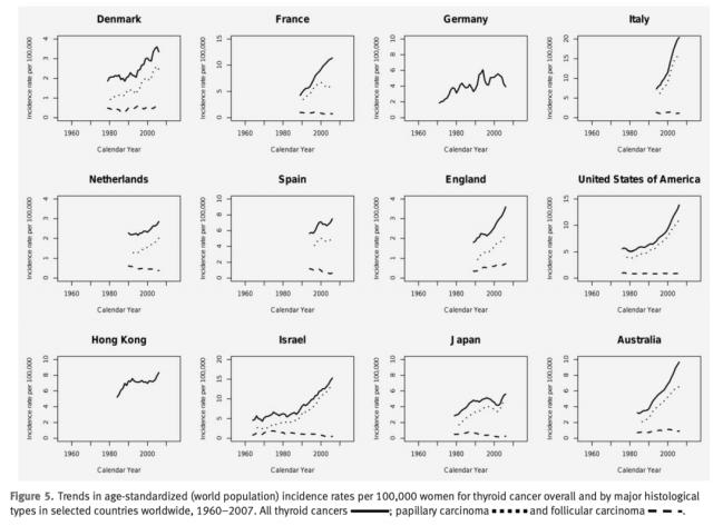 2020 年 3 月份,国际癌症研究机构(IARC)癌症监测处是对的25 个国家 / 地区进行调查,甲状腺癌尤其是乳头状亚型癌的分析,近年由于发病率迅速上升,是由对此病的过度筛查导致的过度筛查。