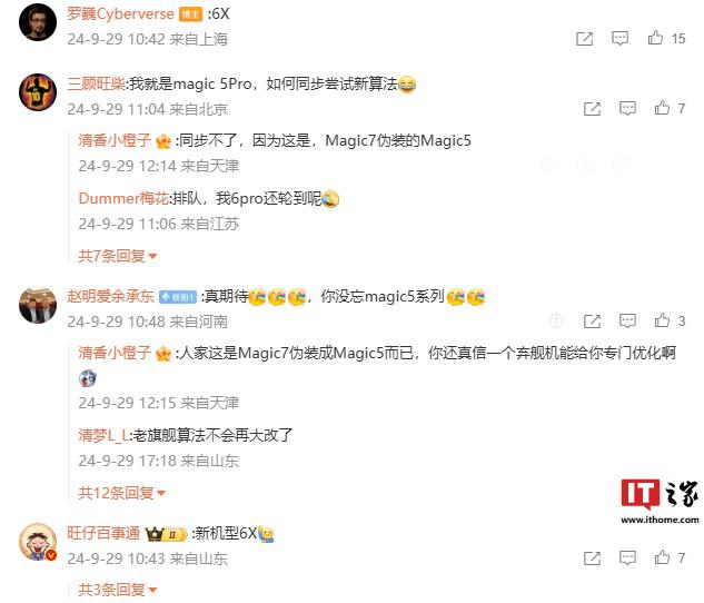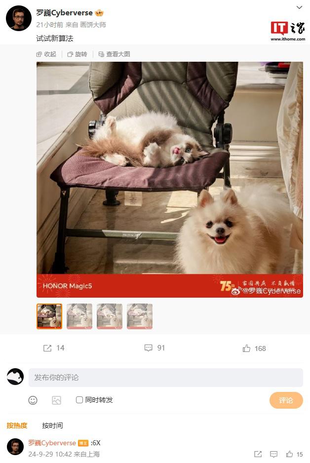 IT 世家 9 月 30 前华为首席影像工程师罗巍昨天发布了一些水印“ HONOR Magic 5 “图片,并配文”试试新算法"。另外,罗巍还在评论区补充了评论"6X"。