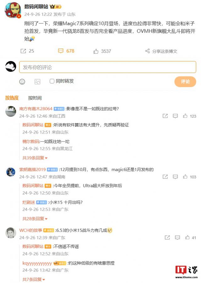 目前还不知道这次拍摄设备的具体情况,但是据报道,荣耀 Magic7 预计今年系列手机 10 月亮出现了,“也许”抢新一代骁龙 8 芯片首发。有网友对荣耀新机的影像水平提出疑问,博主 @数码闲聊站 称"听说软件算法有了很大的改进。"。