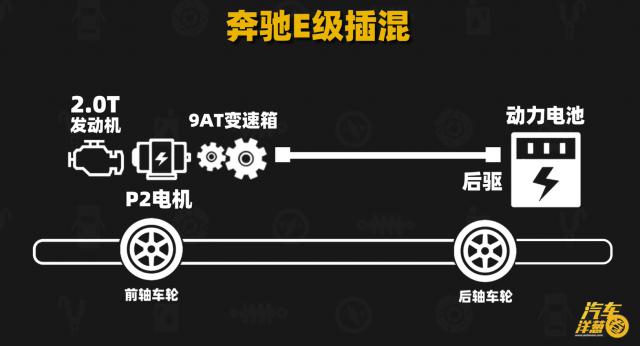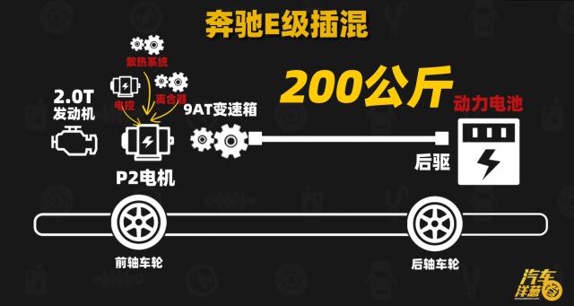 看,发动机没有变化,还是? 2.0T,变速箱没有变化,还是一个完整的。 9AT 变速箱,后驱旋转轴没有变化。还增加了大电池、电机、电子控制、包括电驱动系统的散热等。这个插入混合物 E 级比燃油的 E 级,重了 200 多公斤。