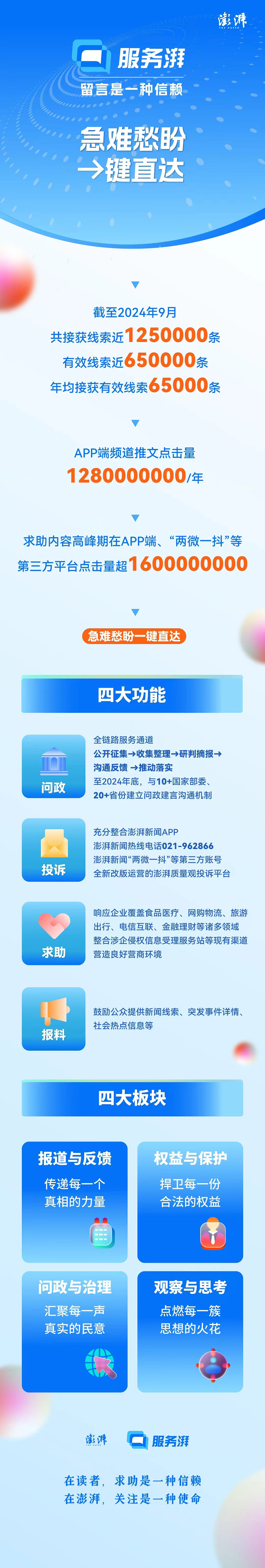 使服务更加连接。截至2024年9月,以澎湃新闻App、主要受理渠道如澎湃质量观投诉平台、澎湃新闻热线电话021-962866等,共接收125000条线索,其中有效线索65000条,每年有效线索65000条。
