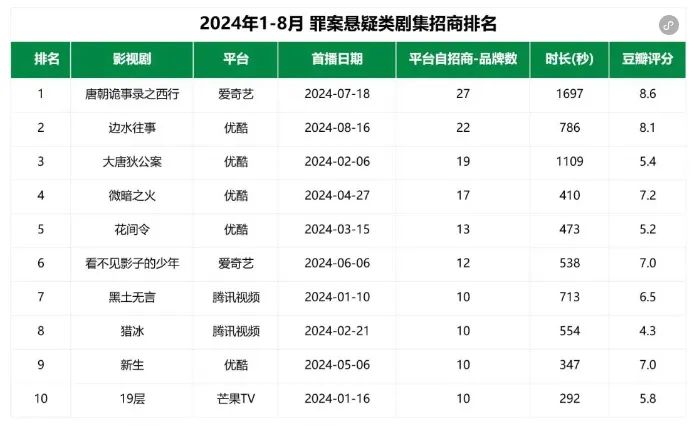 与此同时,“优酷制作”占据了2024年1-8月份犯罪悬疑剧招商TOP10的一半。其中,除了《大一新生》《边水往事》《白夜剧场》走向市场的《开业大作》《黑暗之火》也以17个平台的自我投资登上TOP4。