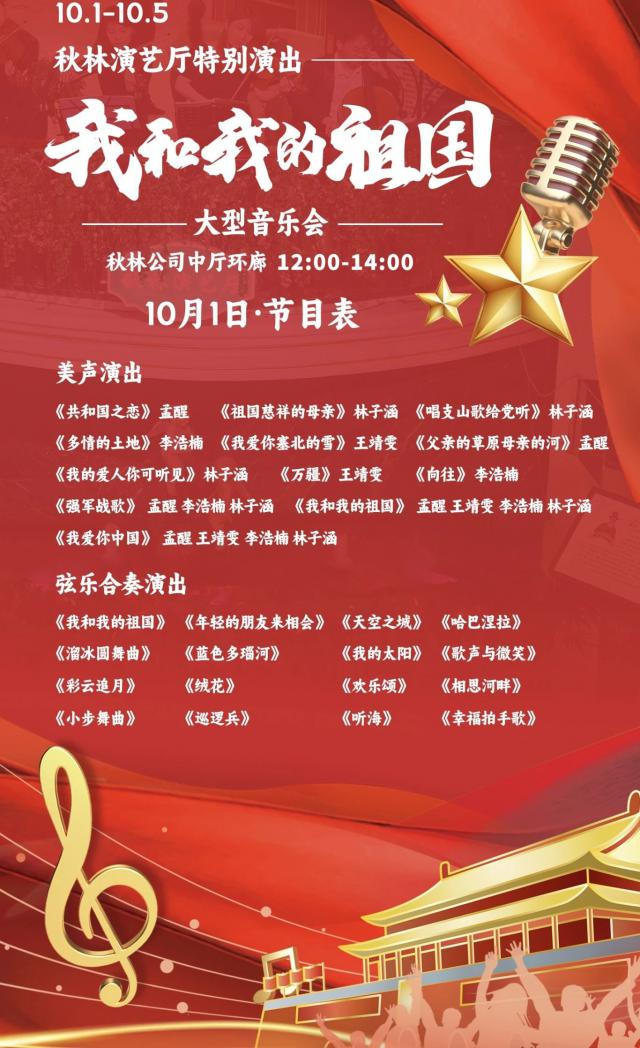 秋林公司与哈尔滨音乐学院合作,邀请男中音青年歌手孟醒偕团队参加演出。音乐会的主题是“我的人民,我的国家”,表演时间是 10 月 1 日到 5 每天中午,每天中午 12 时至 14 时。这次音乐会没有观演限制。,采用不售票表演的方式在东大直街 319 号秋林公司商场二楼舞台区面向公众开放。这场音乐会打破了常规音乐会的表演场景,让大众通过经典美声与民族歌曲、国际与本土音乐的结合,分享优雅的音乐。