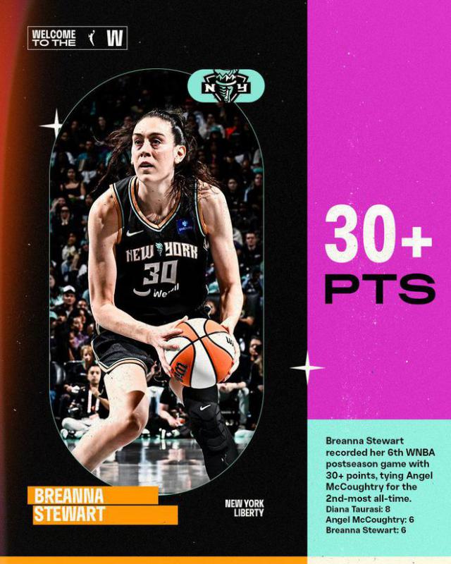 自由人巨星布里安娜在这场比赛中 - 斯图尔特大发神威,她出现了。 35 分 48 秒 19 投 12 中,三分 4 中 2、罚球 9 中 8,狂砍 34 分 5 篮板 4 助攻 2 断球 1 盖帽。这是斯图尔特季后赛的第一名 6 次场均评分 30 ,追平名宿安杰尔 - 并列麦考特里 WNBA 历史第二,仅次于陶乐西。 8 次。
