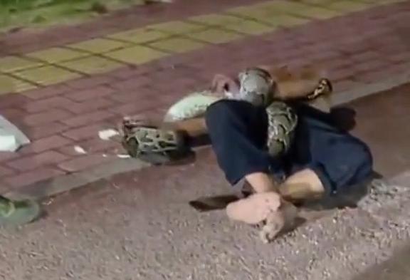 网络爆炸视频显示,该男子穿着黑色裤子,赤脚倒在地上。他的身体被一条蟒蛇包围了。有人报警后,警察和消防队员赶到现场救出该男子并捕捉蛇。