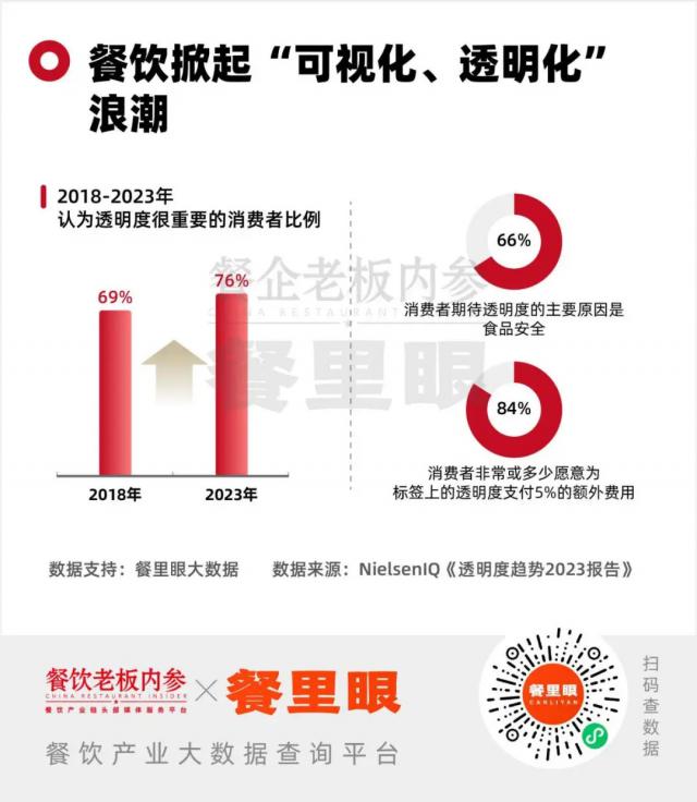 后疫情时代,顾客对“食安”的要求越来越高,对“品控透明”的渴望也越来越强烈。她们更希望餐饮业能打破壁垒,披露更多的质量控制信息,满足知情权,吃得更放心。事实上,餐饮已进入“可视化、透明化”的明牌时代。据 NielsenIQ透明趋势 2023 报告显示,从 2018 年至 2023 2008年,认为透明度非常重要的客户比例从 69% 增长到 除了“看见”之外,76%的客户更希望了解整个供应链的安全性和食品加工过程。