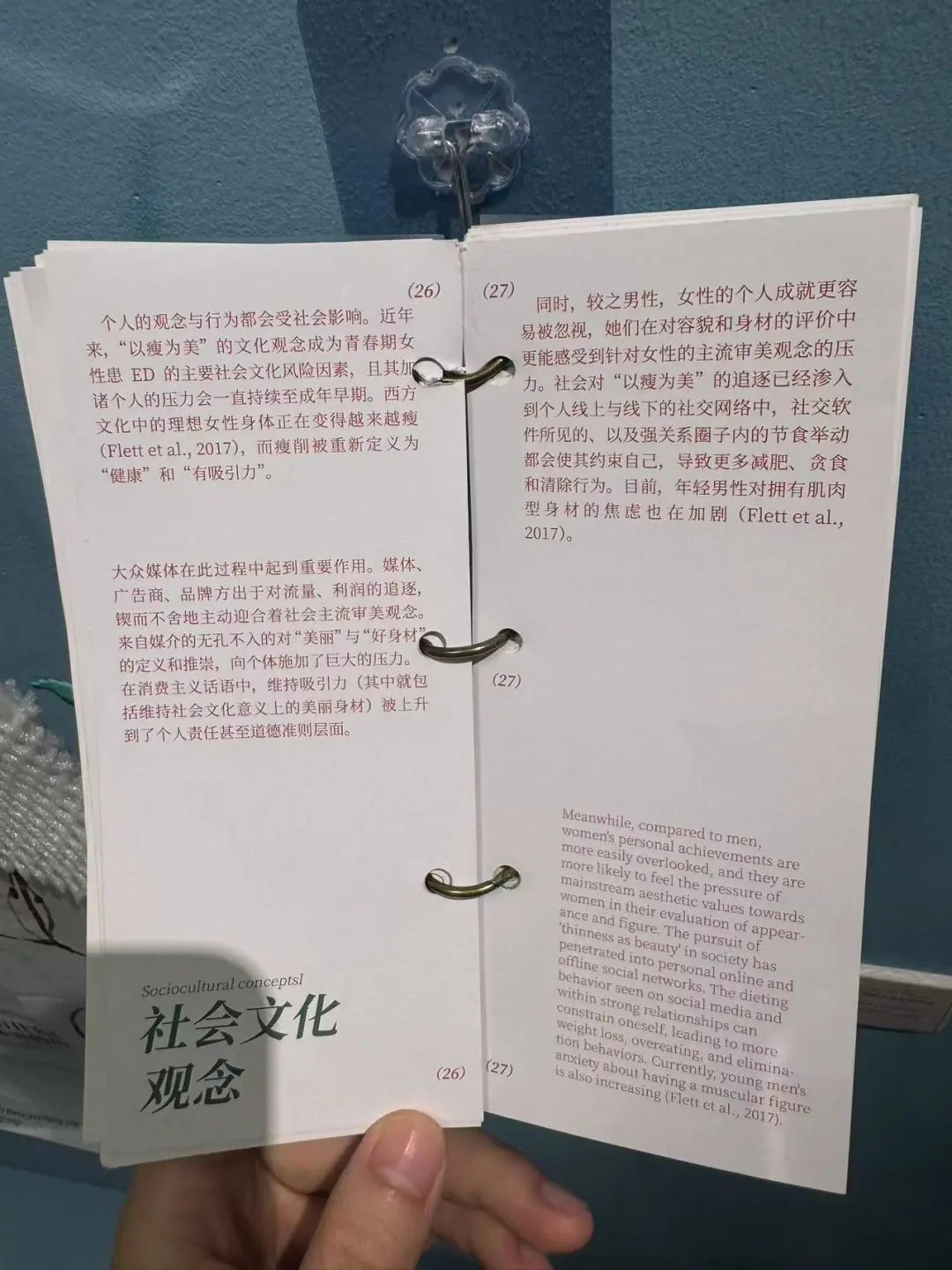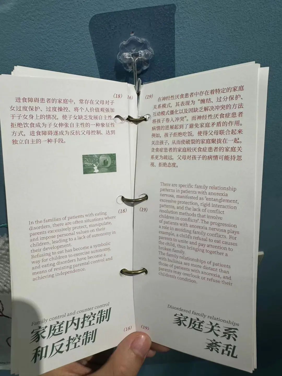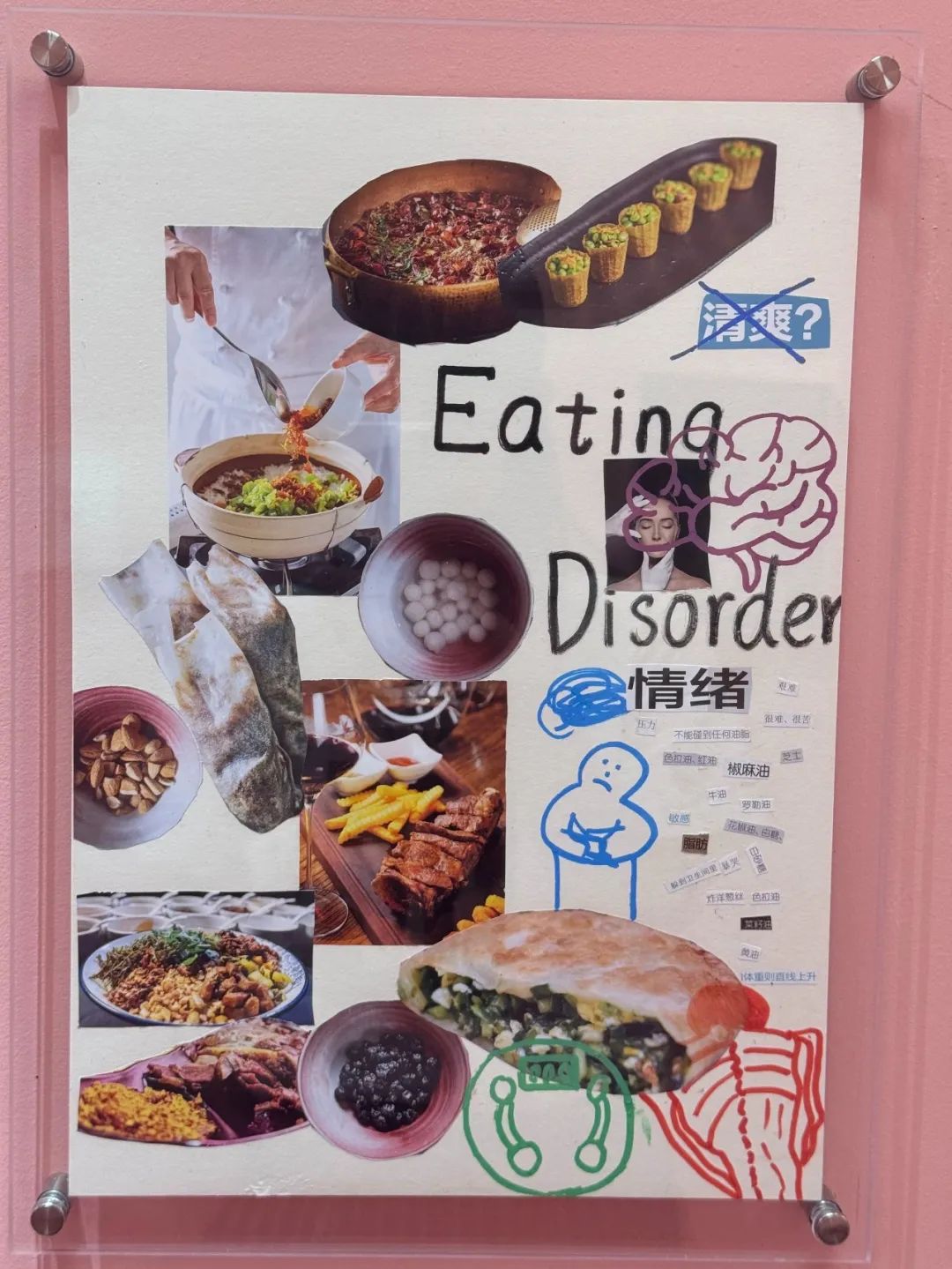 和佳佳一起看展览的朋友也有类似的倾向。那个朋友在国外读本硕,回到国内和父母呆在一起,很不舒服,然后又有吃饭的问题,吃饭变得很困难。在他们意识到之前,他们看到展览中提到,有些人正试图通过吃东西来恢复生活的控制。 另外,童年经历中的取笑或负面事件,也会促使个人过分关注自己的形象。所以,进食障碍是一个复杂的多重因素交互问题。
