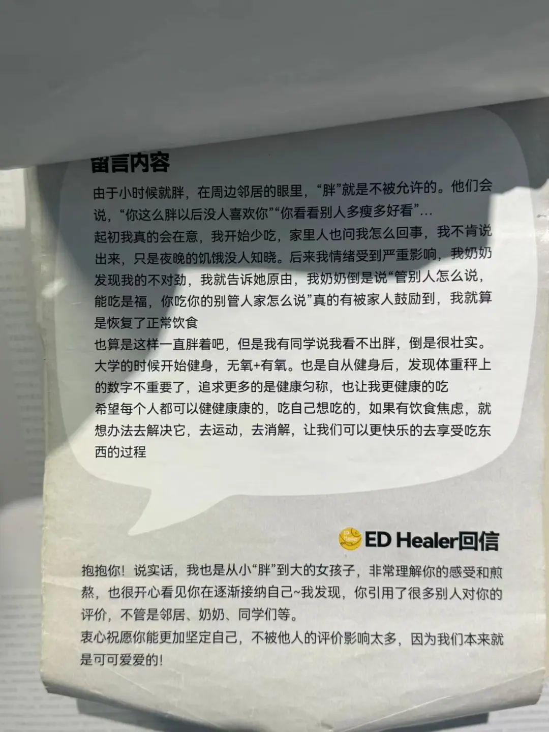 她还记得帮助过一个高三女生,因为身体虚弱,几乎不能报名参加高考。张沁文耐心地和她交流,鼓励她寻找心理支持,分享她的康复故事。之后,女孩康复后被医学院录取,并加入了她们的互助ED。 Healer社区。