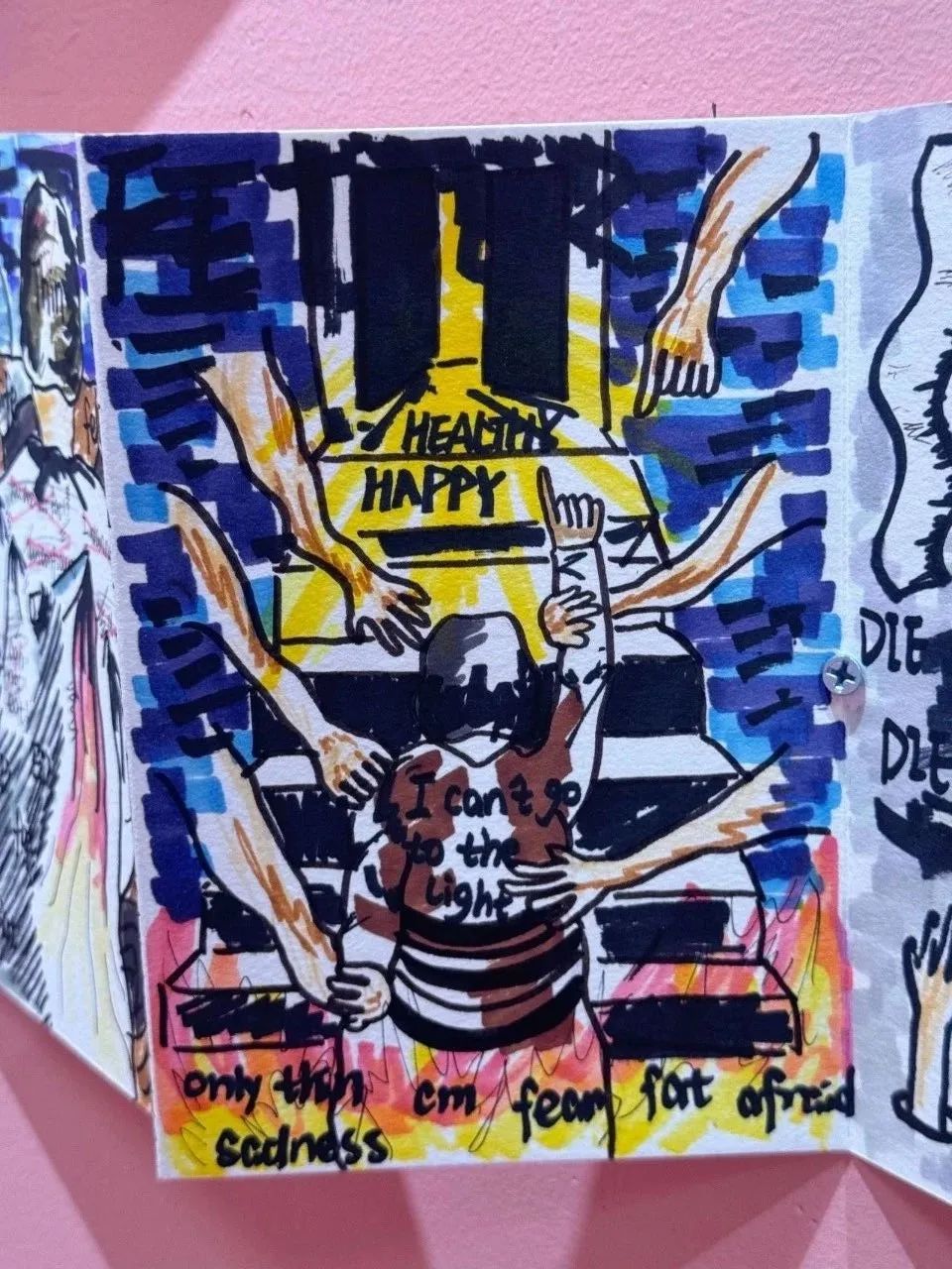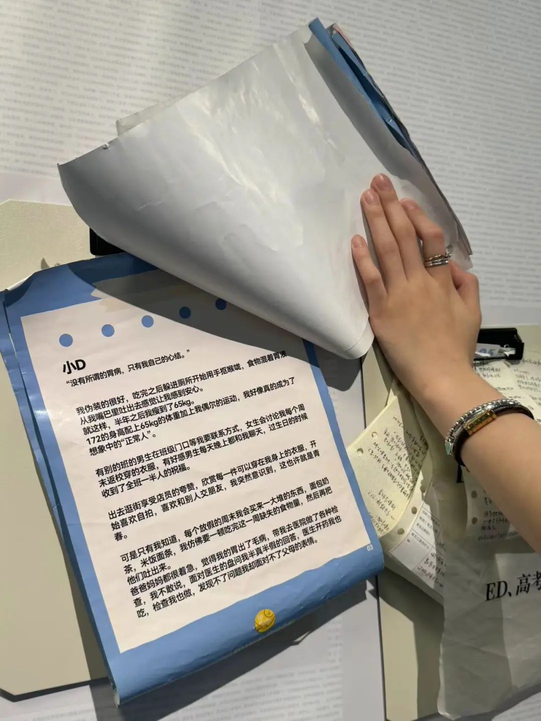 同样的经历,出现在艺术展的众多观众中。反复厌食暴食的小D说,吃完后,她躲在厕所里,开始抠喉咙。“食物和胃液混合在一起,从我嘴里吐出来,让我感到安心”。就这样,半年后,小D瘦到了65kg。这个体重,结合了她172厘米的身高,加上她偶尔的运动,让她觉得自己真的变成了一个“正常人”,似乎没有所谓的胃病或进食障碍,只剩下“你现在能接受自己吗”的结。