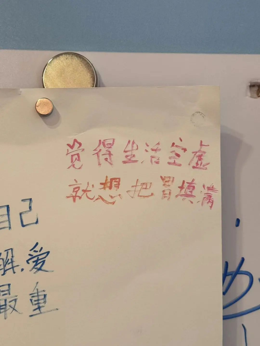 “似乎我们必须不断提升自己,让自己变得特别好。如果你得不到外界的爱,你只能给自己爱。”她觉得外表好看,心里会舒服。她突然觉得镜子里的自己很丑很胖,于是决心减肥。