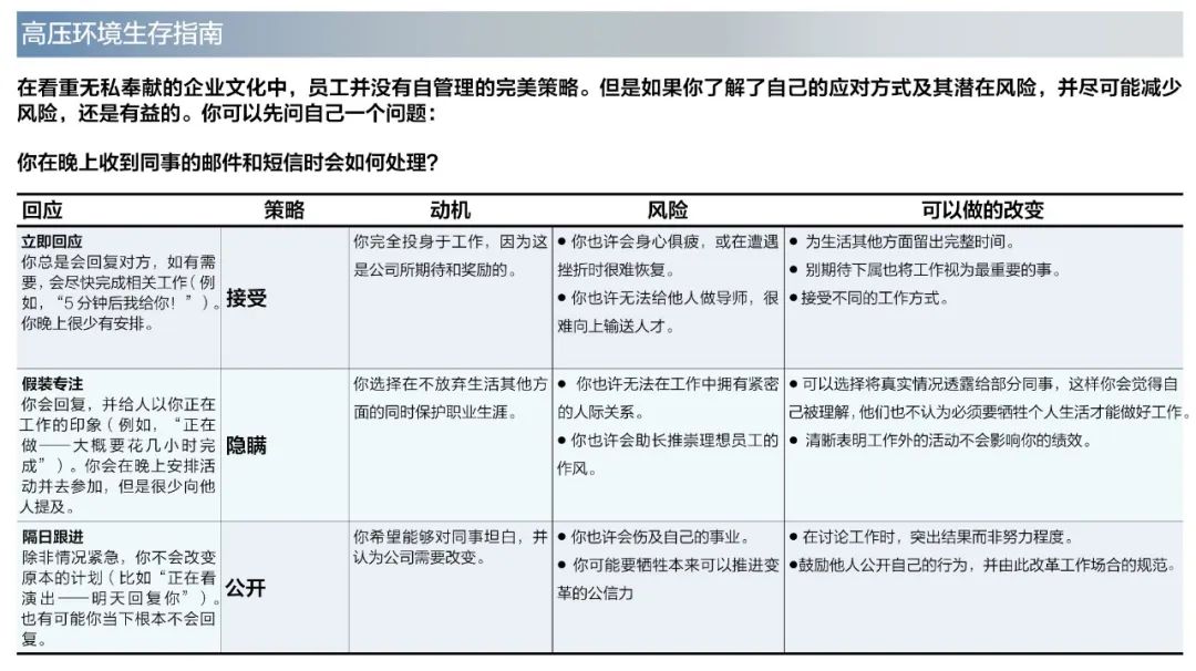 在硅谷、华尔街、伦敦和香港的许多企业中,员工超时工作并不少见。经理榨取下属已经成为常态。他们在假期联系员工,临时分配工作。为了满足上级的要求,员工不得不早起,熬夜加班,周末不能休息。他们必须24小时盯着电子产品。那些不能或不愿意及时回应这些要求的员工通常会受到惩罚。