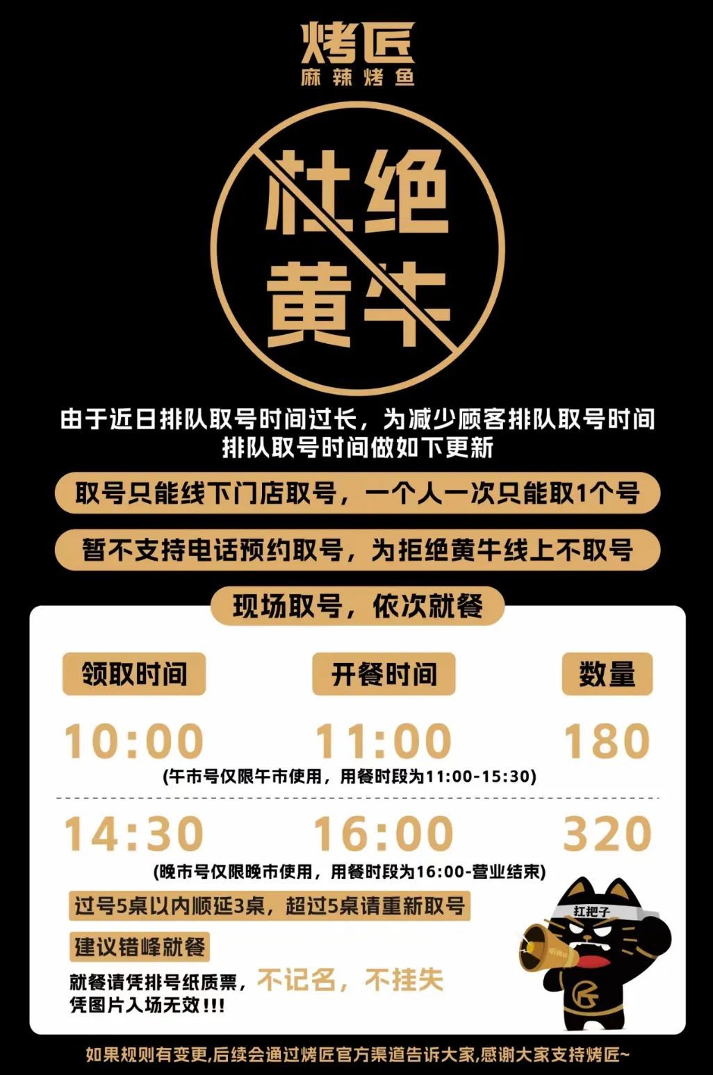 “烤匠”烤鱼店表示,为了解决“黄牛”现象,改进了取号方式,客户需要线下取号,预留手机号,用纸质排号票和手机尾号进入市场,减少了“黄牛”的转售现象。