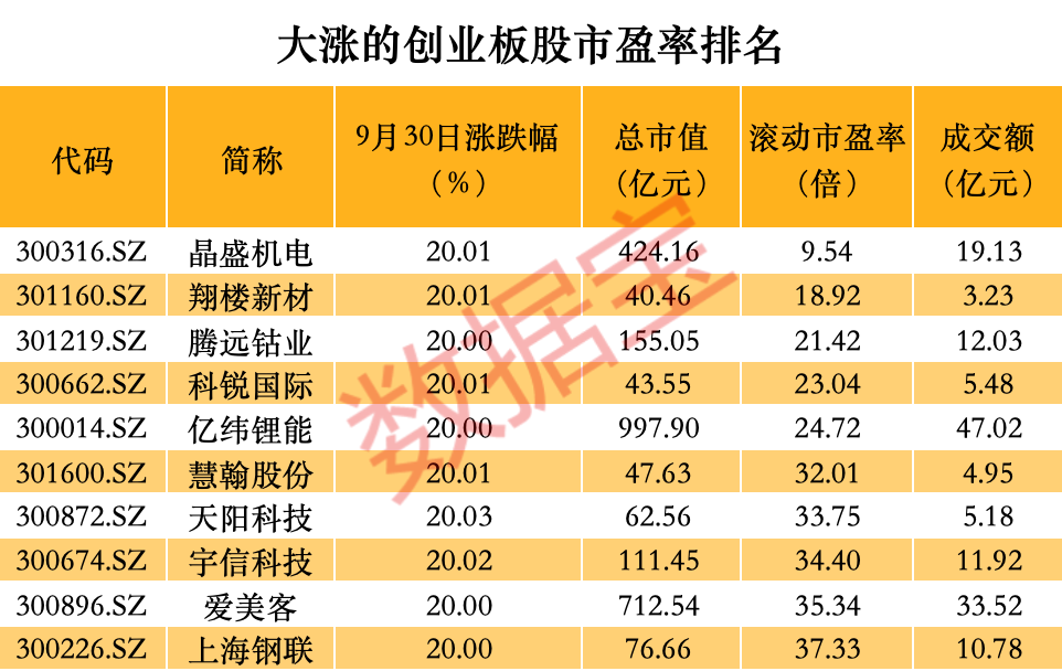 创业板的涨跌限制也是20%,但开户门槛较低,只要10万元,对大多数投资者都很友好。9月30日,60多只创业板股票涨幅为20%,说明其流动性更好。