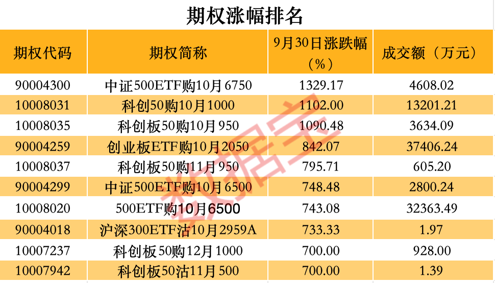 节前期权市场上涨,中证500ETF10月6750期权涨幅超过13倍;科创50购10月1000期权,科创板50购10月950期权均涨幅超过10倍。