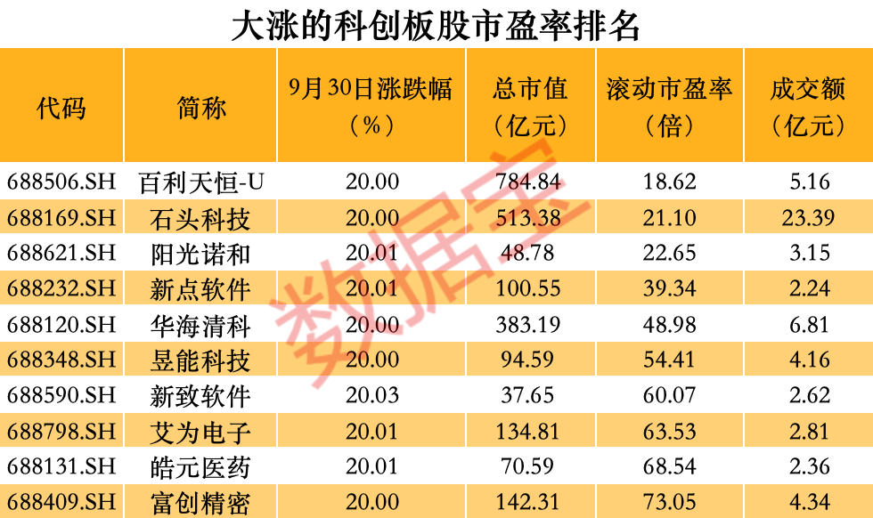 科技创新板的开户限制与北京证券交易所相似,涨跌限制为20%。9月30日,科技创新板上涨了20%的股票多达25只,前十只股票的成交额较高,如云从科技、芯原、美迪西等。