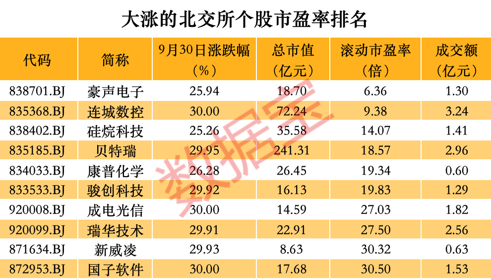 北交所十大股票中,9月30日成交额超过1亿元的股票多达9只,包括曙光数创、连城数控、中草香料等。其中,连城数控的市盈率较低,不到10倍,成电光信不到30倍。牛市将率先消灭低估值股票。在9月30日涨幅超过25%的北交所股票中,豪华电子和连城数控的市盈率低于10倍。