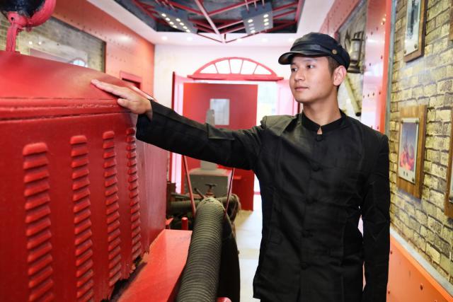 推开红色的大门,映入眼帘的是大厅里摆放着几个旧灭火设备: 20 在世纪初出现的手压式龙,被称为“洋龙”, 1937 每年抗战前的机械“泵浦”, 1950 一年后一度使用的轮试救火车等。