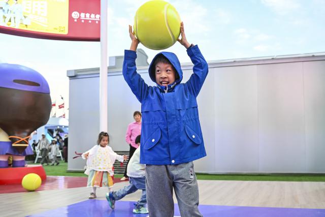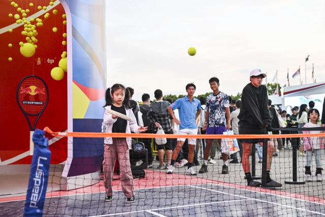 球迷们的热情完全点燃了网球大师赛的现场,10。 月 2 日本,旗忠网球中心的球迷广场,孩子们在互动区的每一个展位上玩游戏,赢得奖品,玩得不亦乐乎。