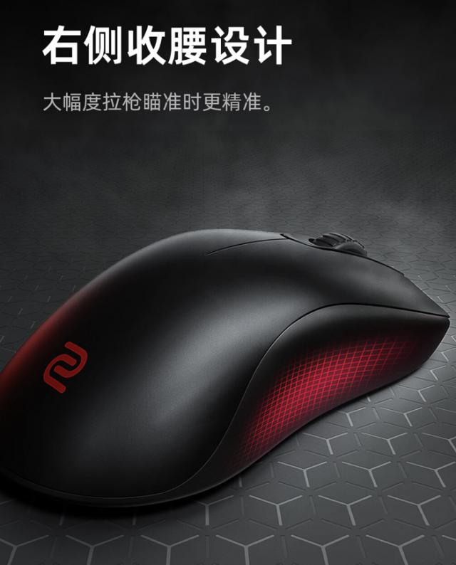 外观方面,这款鼠标一般采用黑色和红色配色,采用对称的低鼠背设计,整体重量 65 克,鼠标右侧采用收腰设计,前端采用倒梯形设计。