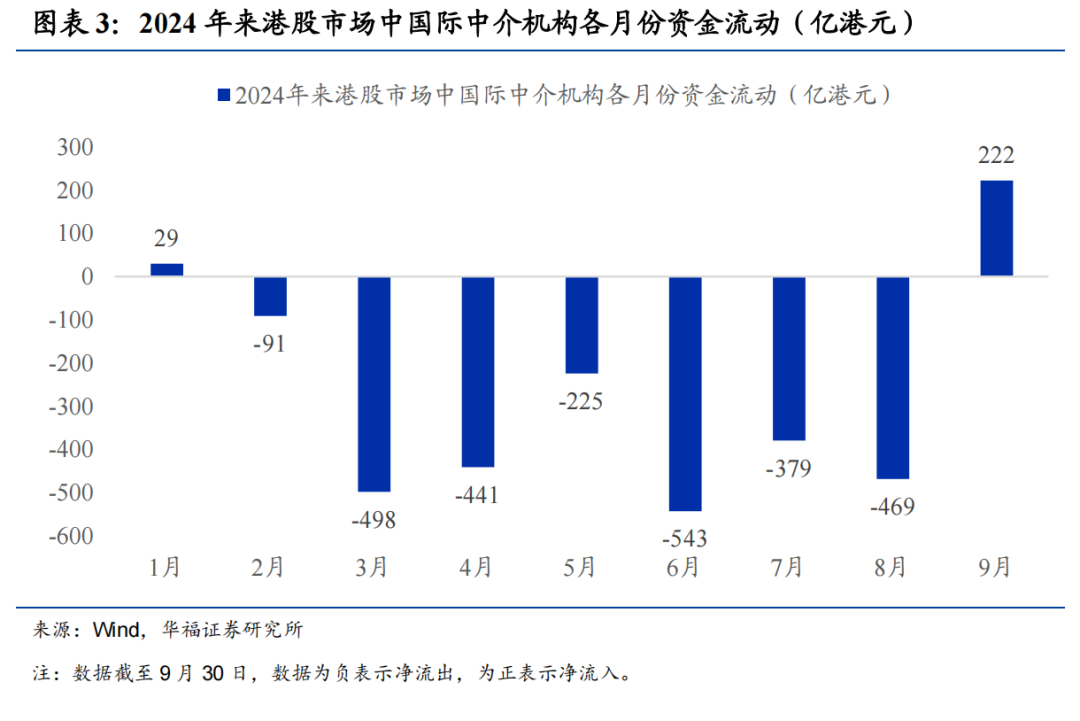 九月份港股市场中国际中介资金在连续几个月流出后再次转为净流入,成为市场上重要的增量资金。自2020年疫情爆发以来,港股市场的增量资金结构发生了显著变化。一方面,以国际中介为代表的海外资金继续流出港股市场,另一方面,以南下资金为代表的内地资金继续涌入港股市场。但从最新的边际变化来看,一个有趣的现象是,自9月份以来,港股市场的海外资金开始转为净流入,9月中下旬以来,国际中介机构资金净流入规模达到396亿港元,超过了南下资金205亿港元的净流入。