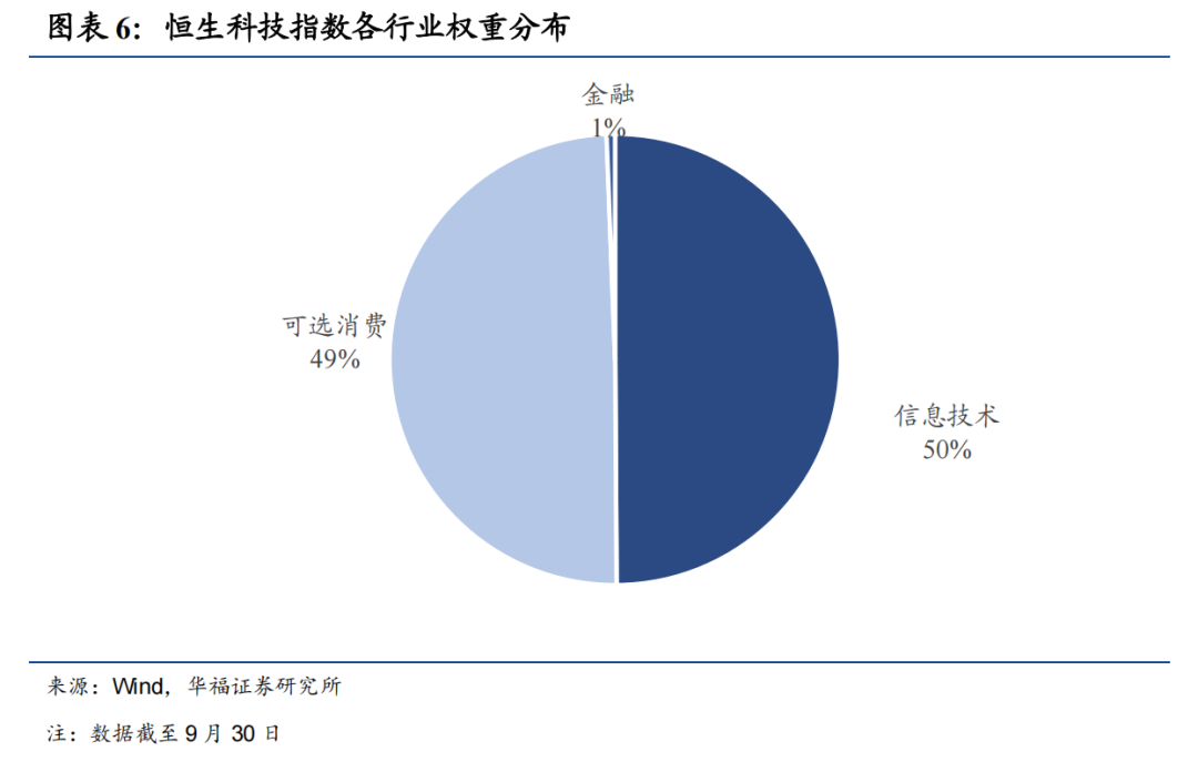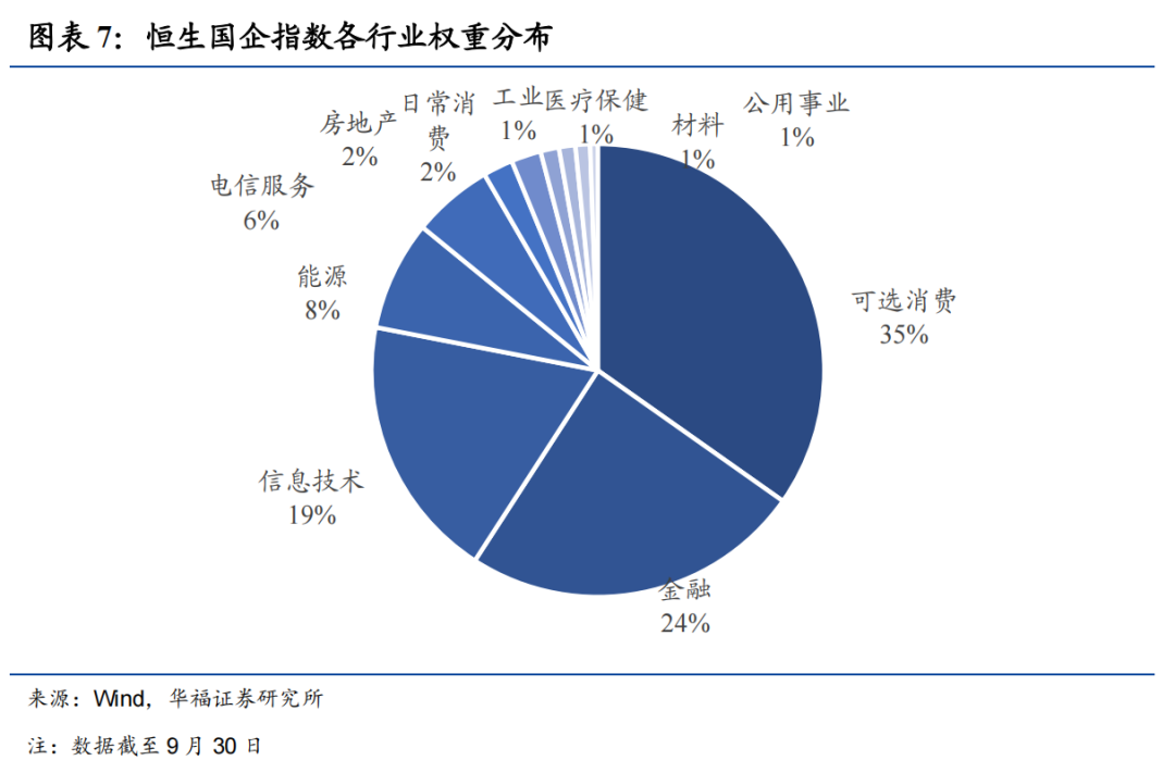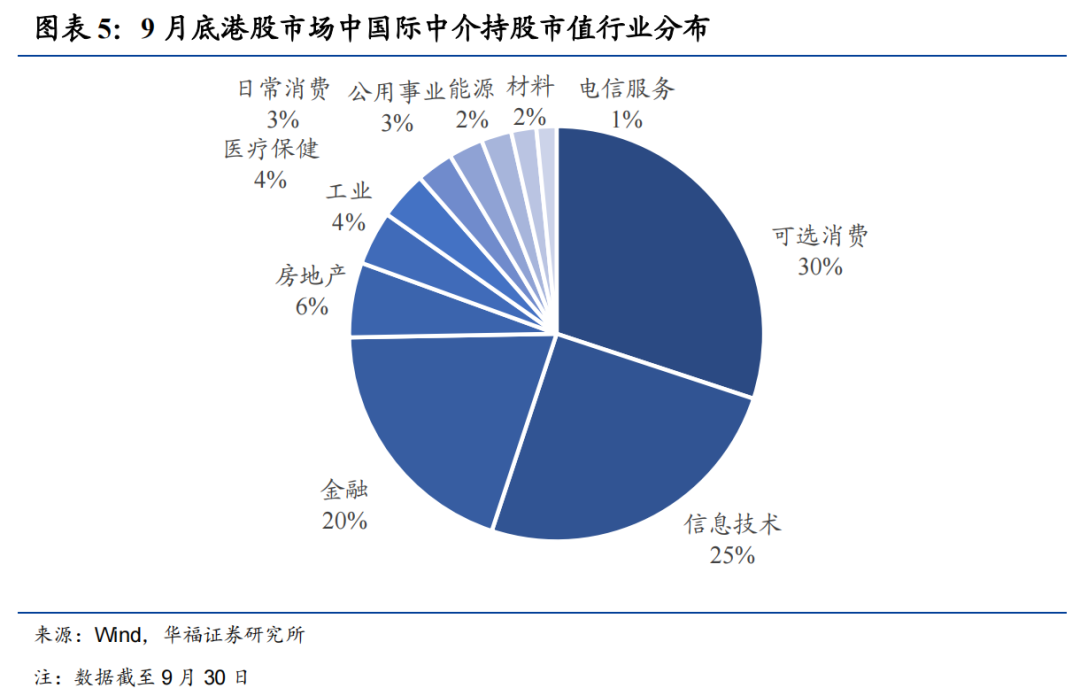 在港股市场,国际中介偏好可选消费和信息技术板块,这也是恒生科技指数的重要组成部分。从这个角度来看,我们认为恒生科技指数在9月中下旬以来,国际中介资金的快速回流是一个重要因素。截至9月30日,港股市场可选消费行业占30%,信息技术占25%,远超其他行业。在恒生科技指数中,信息技术行业的权重占50%,可选消费占49%,远高于恒生国企指数的19%和35%。因此,我们认为恒生科技占据9月中下旬以来港股市场外资大幅回流的重要原因之一。