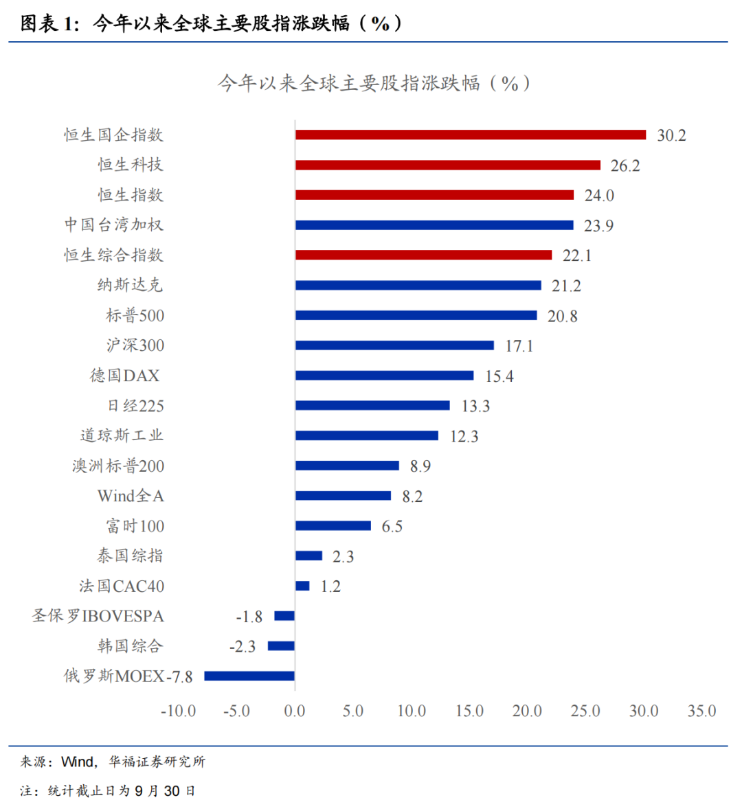 自九月中下旬以来,港股市场大幅收涨,主要股指全年涨幅在我们统计的主要市场中大幅领先。截至9月30日,恒生国有企业指数全年累计增长30.2%,恒生科技指数和恒生指数累计增长26.2%和24.0%,在我们统计的主要市场中名列前茅。尤其是9月中旬以来,恒生科技指数在短短半个月内累计上涨36.6%,在我们统计的主要市场中占据显著优势,远优于恒生综合指数和恒生国企指数,呈现出较高的弹性。