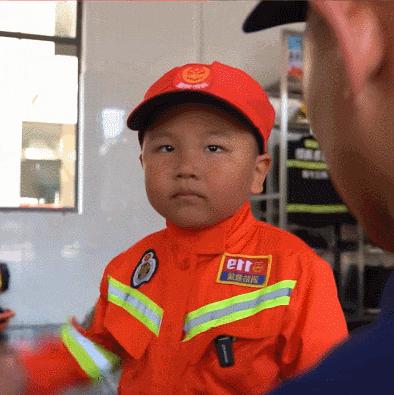 接着,消防队员拿出一套橙色的消防救援服,穿在晨晨身上,戴上帽子,系上腰带,早晨很快进入“角色”,向消防队员敬礼。