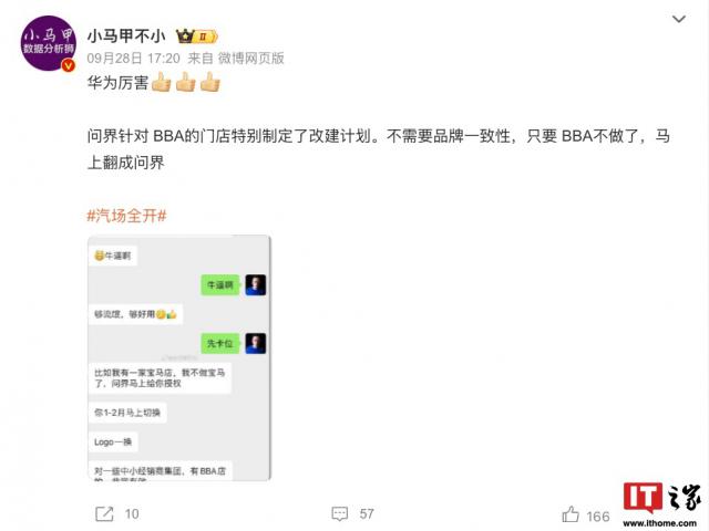 IT 世家 10 月 3 每日新闻,博主 @电盒校长 微博爆料说问界是针对微博的。 BBA(奔驰、宝马、奥迪)商店制定了一个改造计划,这个策略据说是为了“更快地拓展营销网络,提高品牌竞争力”,不过截至 IT 世家发稿,博主原发帖已被删除。。