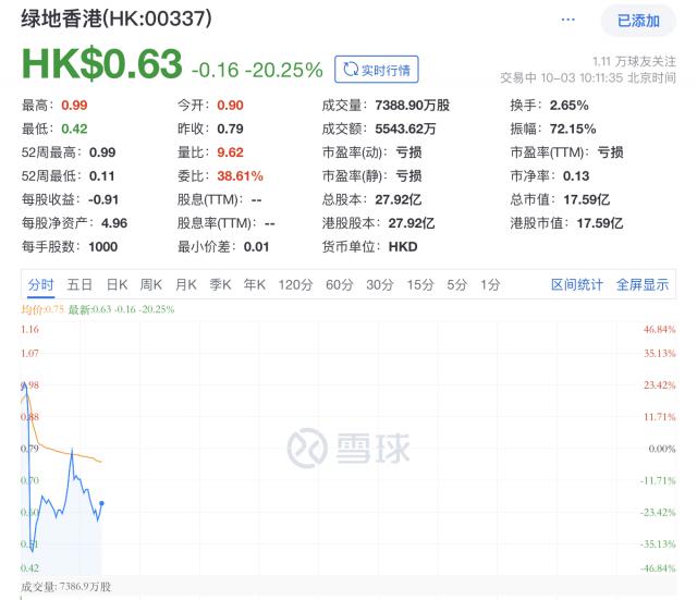 乐居财经 吴文婷 10 月 3 日本,港股地产股普遍回调,绿化香港跌破 20%。