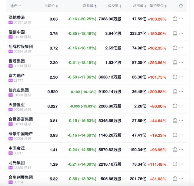 港股地产股转跌,香港绿化跌破20%