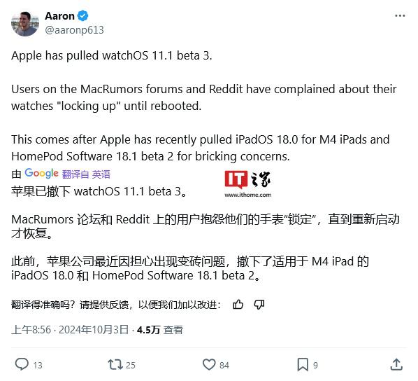 IT 世家查询 Reddit 社区、X 社交平台,发现部分社交平台 Apple Watch 升级用户反馈 watchOS 11.1 Beta 3 设备在版本之后出现 Messages 资料同步问题,以及“死锁”问题。