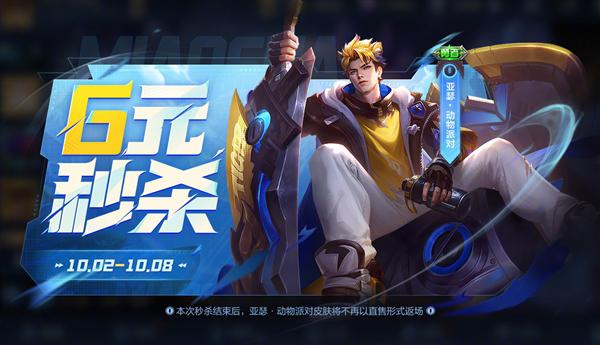 按照活动规则,10 月 2 日 0:00-10 月 8 日 23:59 亚瑟动物派对皮肤限时秒杀!60 点券相当于 6 元人民币。