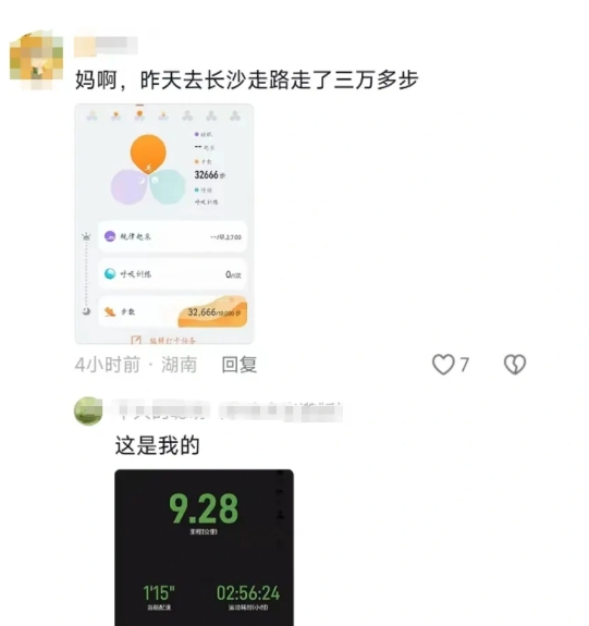 国庆节期间,一些游客展示了他们的步行记录,截图显示每天的步行计数为3266步。另一位网友迅速跟随帖子,还展示了他的步行记录。截图显示,他在不到3小时的时间里走了9.28公里。为了好玩,长沙游客真的很努力!