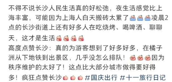 除了感受长沙的烟火,游客还高度赞扬长沙:“我真的为游客想了很多。从下地铁到橘子洲的景点,我几乎没有排队!因为秩序维护得很好!疯狂点赞长沙!”