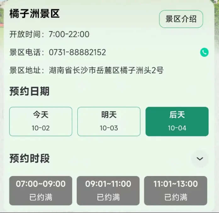 根据岳麓山橘子洲景区的预约页面,目前景区可以提前预约到10月4日,但是剩下的票都是0,很早就预约了。