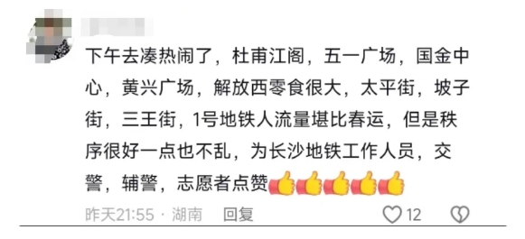 一位外出“看热闹”的当地网友表示,“1号地铁客流堪比春运高峰”。虽然人多,但“秩序很好,一点也不乱”,“赞美长沙地铁工作人员、交警、辅警、志愿者。”