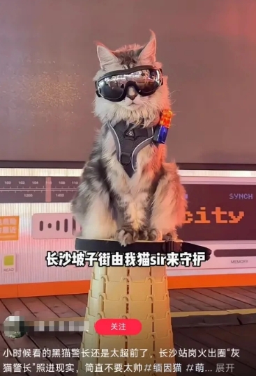 今年国庆节,坡子街派出所门前的“灰猫警长”也火了。它穿着酷炫的装备,坐在景区里,情绪稳定,不时与游客互动。不知道是不是工作“累”。坐久了的“猫先生”似乎有班级的味道。